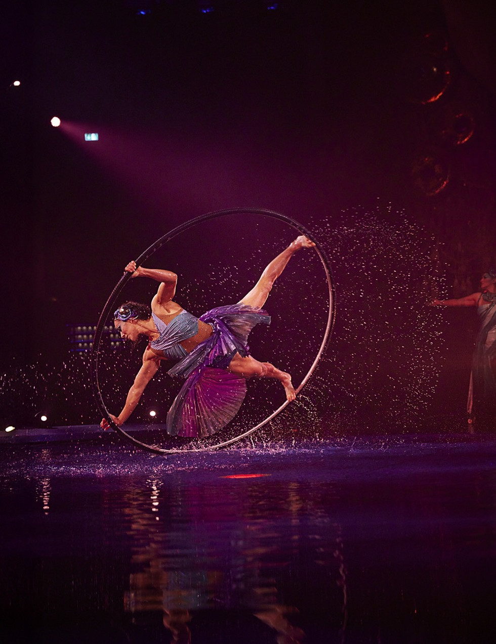 Músicos en vivo, juegos de luces que imitan reflejos sobre el agua y un momento inesperado —la Orquesta de Cristal, donde el público participa activamente— preparan el ánimo para lo que vendrá. Es un ritual elegante, lúdico y sorprendente, fiel al ADN de Cirque du Soleil.